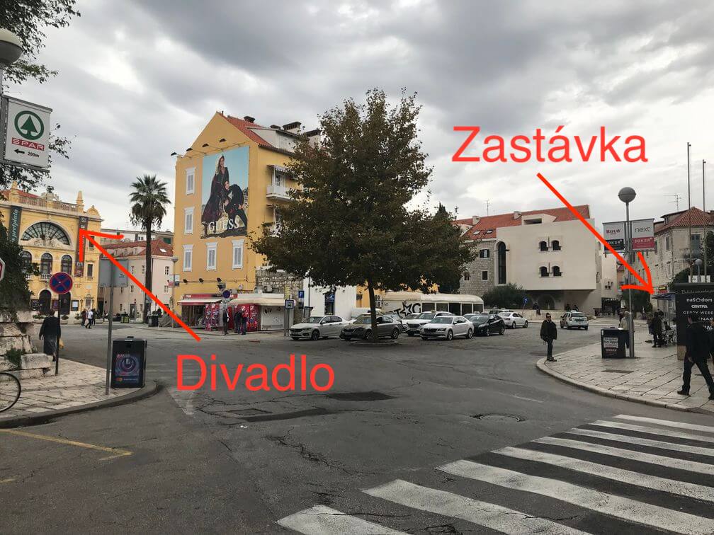 Tímto místem je autobusová zastávka poblíž divadla. Hned za zastávnou je místni diskotéka, pokud byste chtěli zažít i splitský noční život a třeba se seznámit.