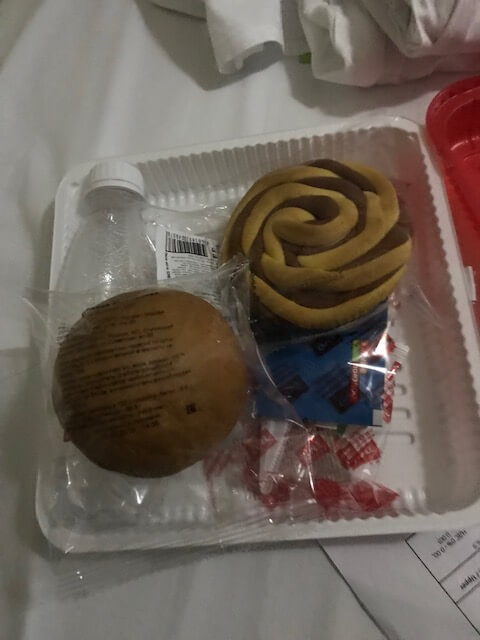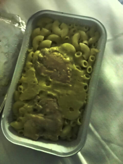 Ve vlaku jsem dostal kuře s těstovinami, ačkoliv jsem nekupoval jízdenku s jídlem. Paní vám dá vybrat, zda chcete jídlo hned nebo ráno k snídani. Většinou si vybíráte kuřecí, nebo vepřové. Na stolku máte krabičky, ve které najdete vodu (ta na WC není pitná! Takže tuto máte i na čištění zubů), nějaké jídlo (já měl bulku, salám, sladké pečivo a mentolový bonbon), plastové příbory k tomu kuřeti a jednorázové modré pantofle.